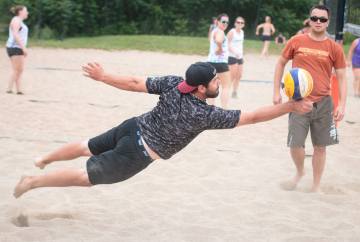 The Co-Ed Fred beach 4’s volleyball league plays every Monday (Tier 1) and Thursday (Tier 2) night from June to August at the Fredericton Loyalist Rugby Club grounds.