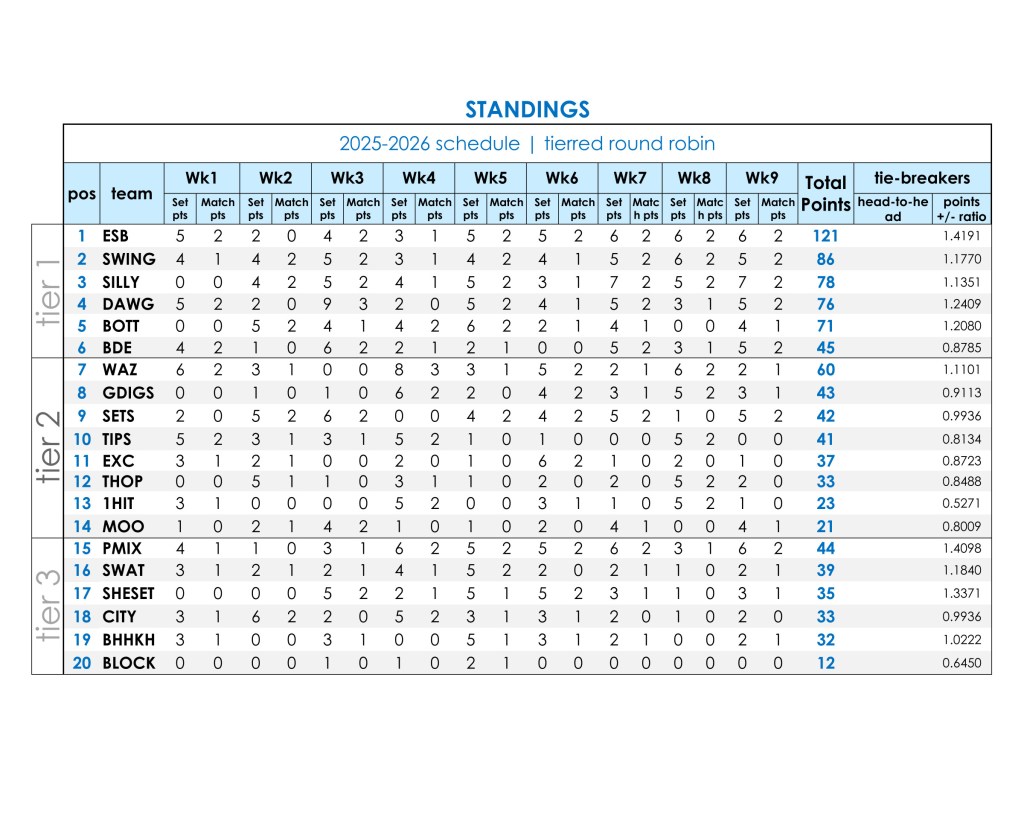 Sorted Standing Results from Tiered Round Robin Schedule 2025/2026: